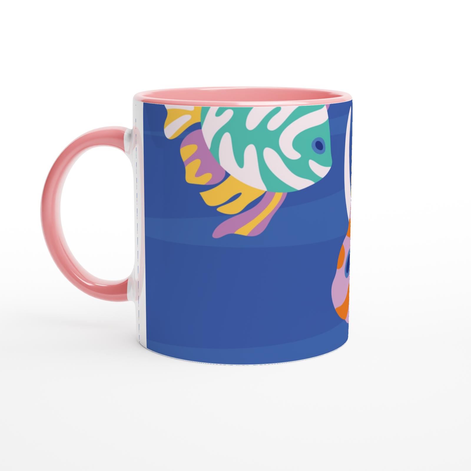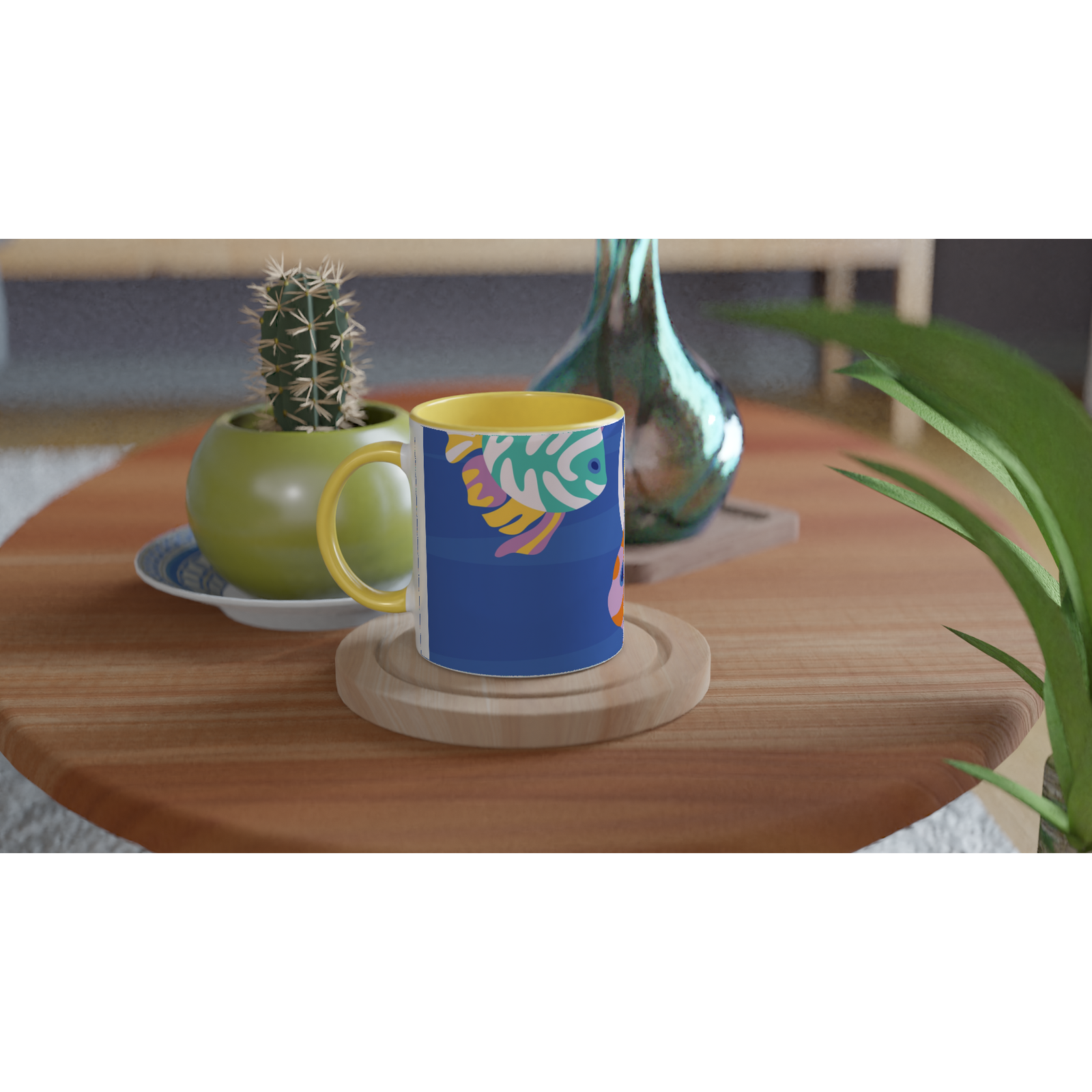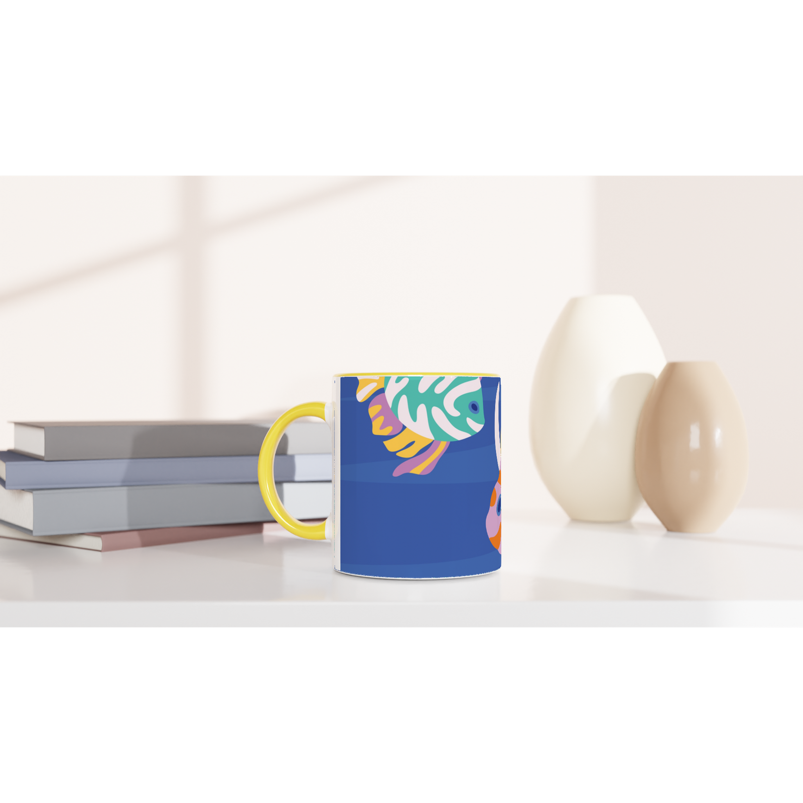 This beautiful ceramic mug is perfect for any event of the day. Your morning coffee, a hot chocolate, or any other hot beverage you enjoy. The mug is glossy white with a colored rim, inside, and handle. The prints come out beautifully and vividly on it. The print retains its quality and luster when used in both microwaves and the dishwasher.