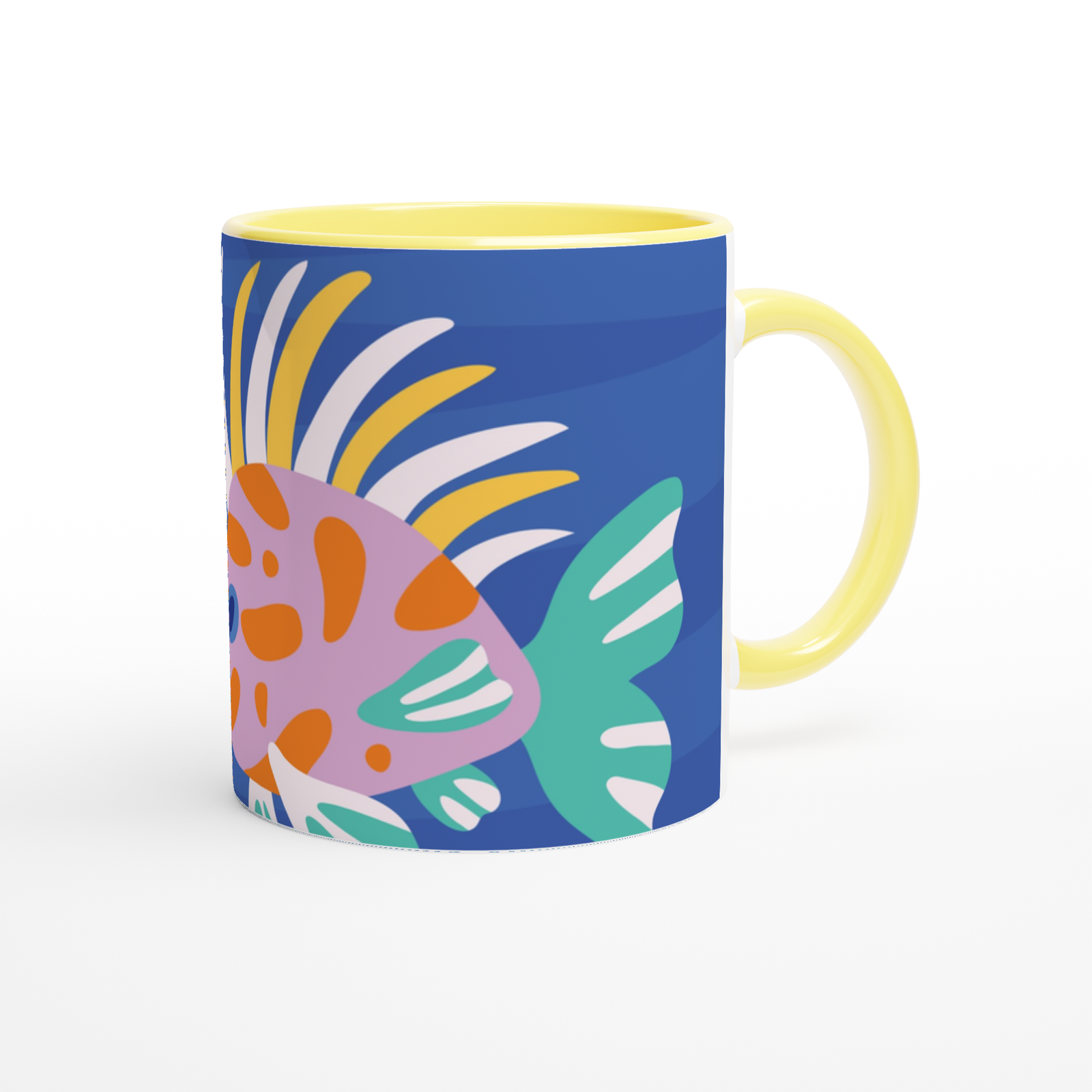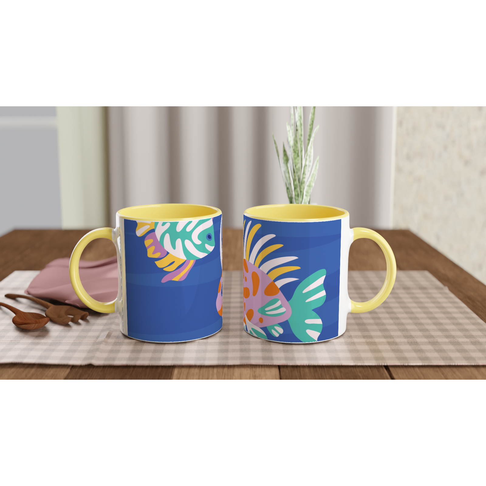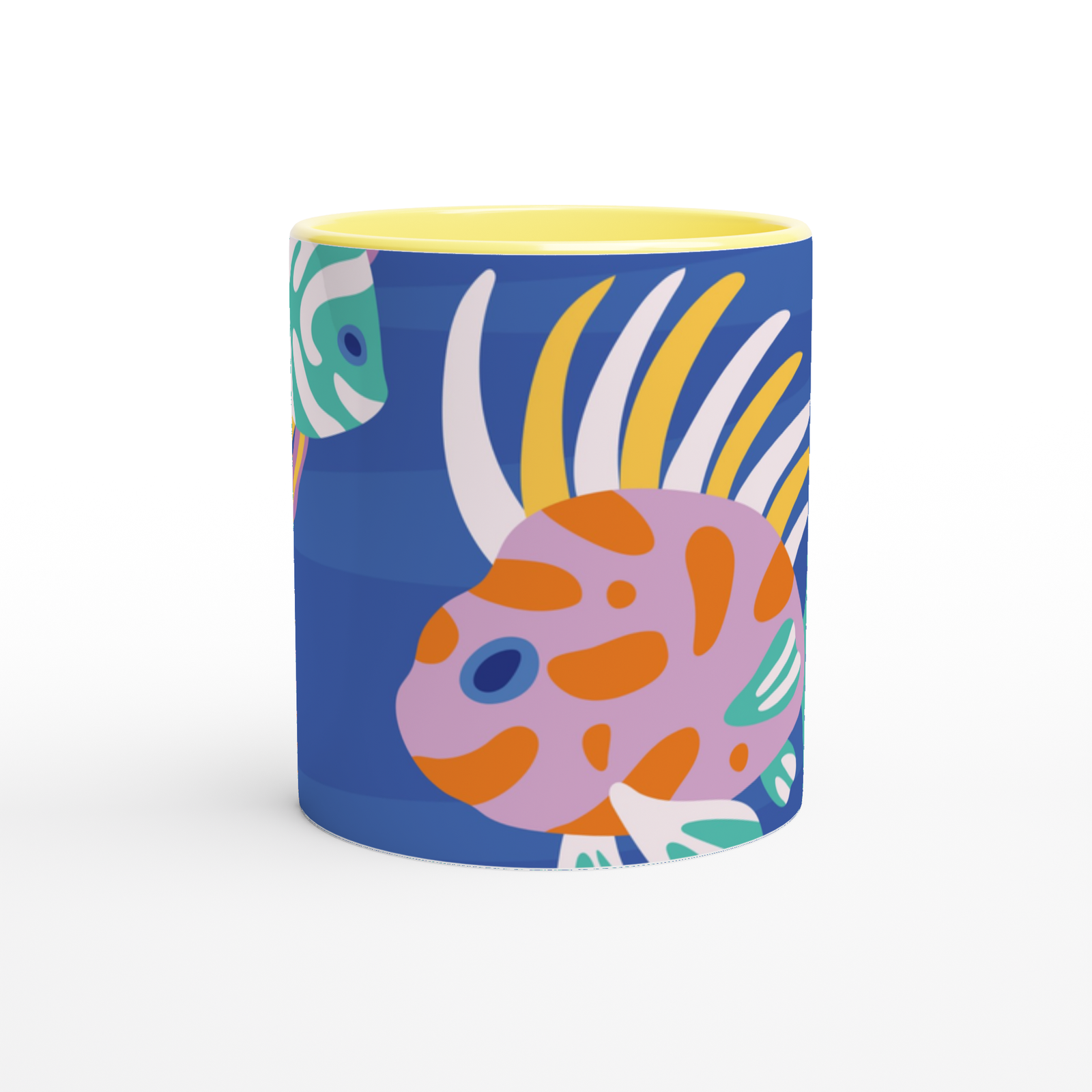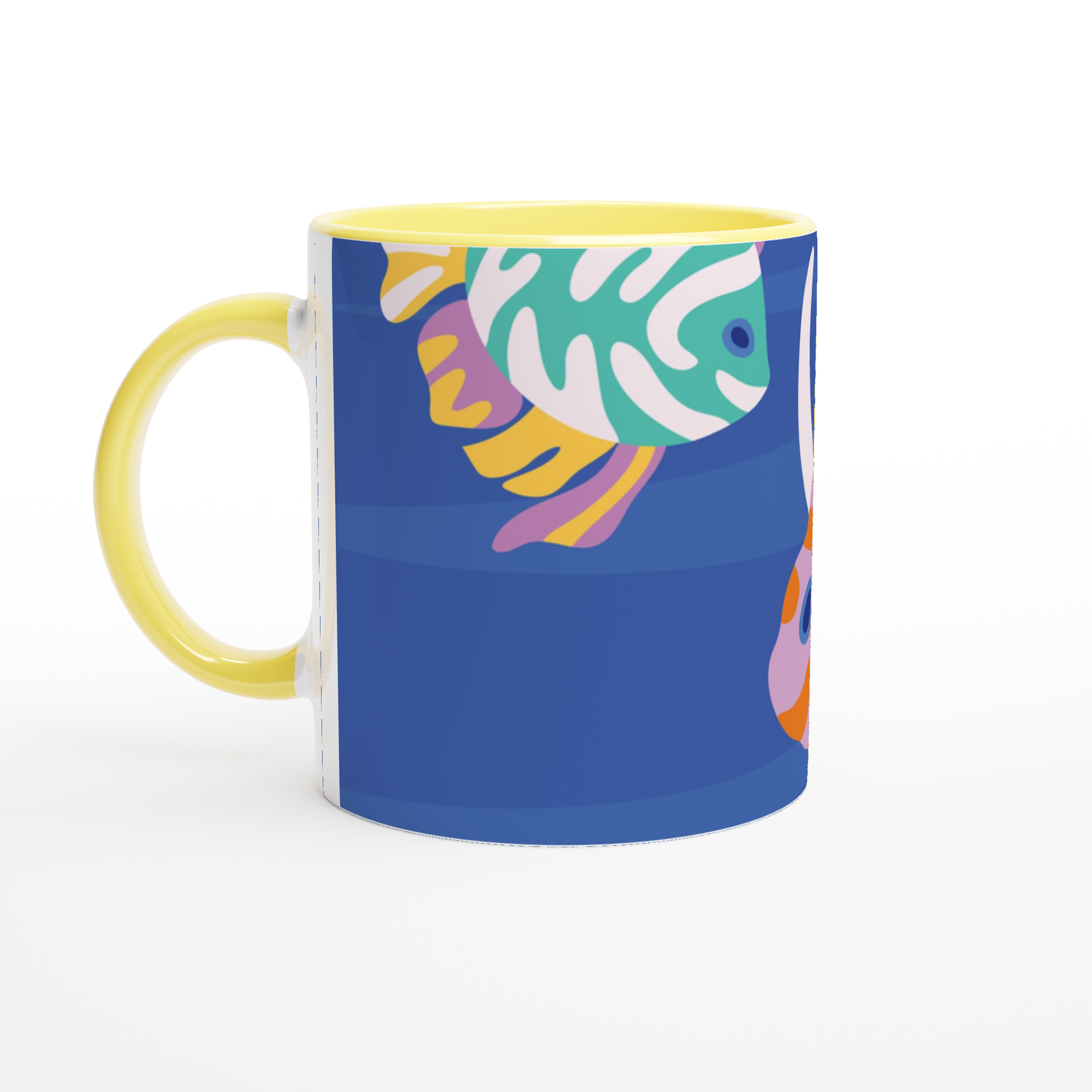This beautiful ceramic mug is perfect for any event of the day. Your morning coffee, a hot chocolate, or any other hot beverage you enjoy. The mug is glossy white with a colored rim, inside, and handle. The prints come out beautifully and vividly on it. The print retains its quality and luster when used in both microwaves and the dishwasher.
